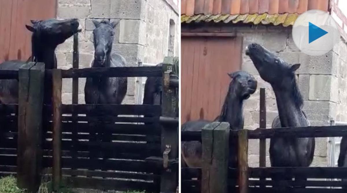 De här hästarna behöver inget badkar eller någon vattenkopp för att släcka törsten. Ett rejält ösregn och vatten från ett närliggande tak funkar ju alldeles finemang!