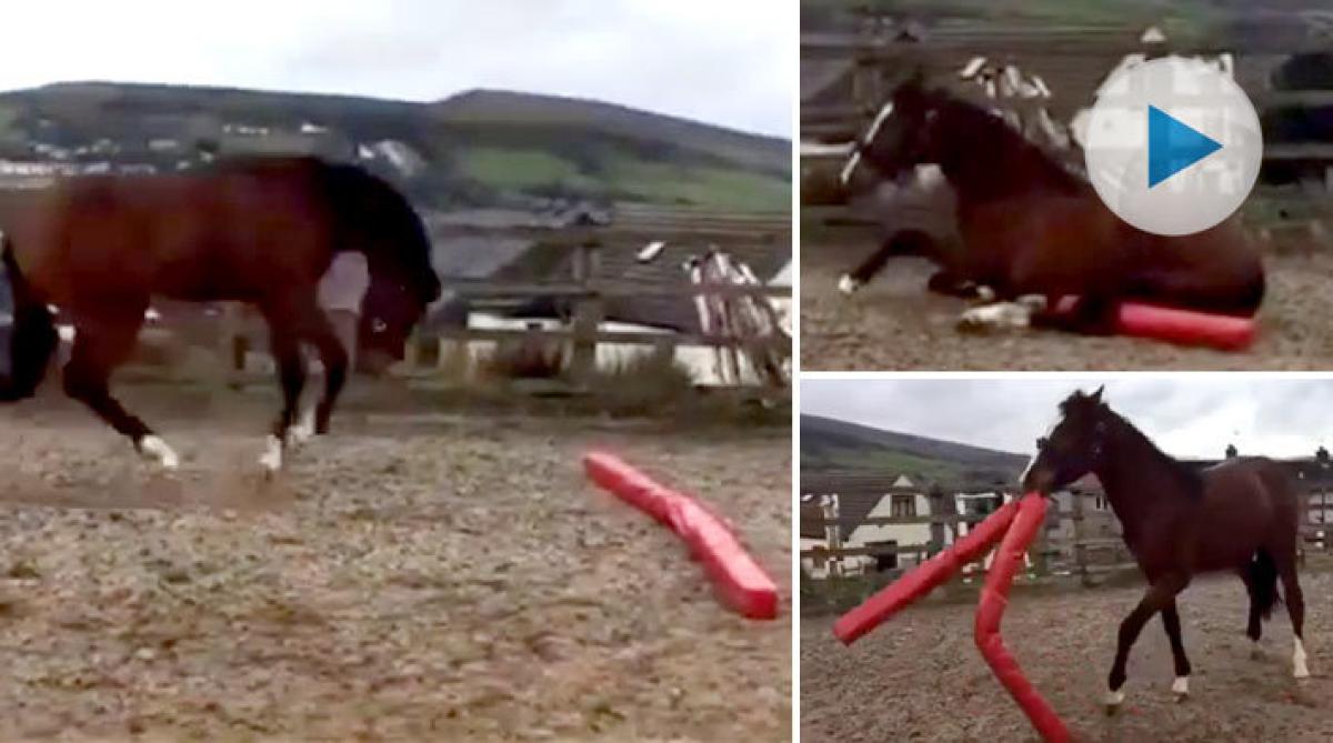 Hoppa – den?!? Nä, man kan inte vara riktigt säker på om den mjuka plastbommen som ligger i paddocken är vid liv eller inte. Så det är lika bra att ge den en rejäl omgång direkt…