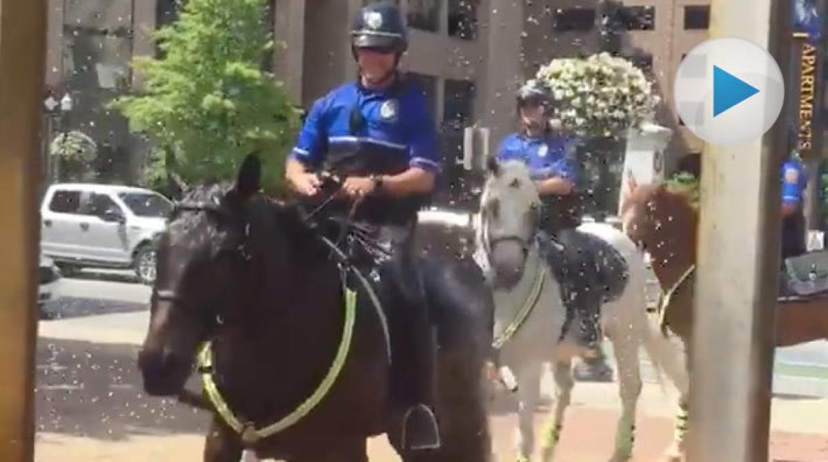 Det är inte bara här i Sverige som vi söker svalka och skugga denna heta sommar. Polisrytteriet i Lexington, USA, hittar nedkylning i en av stadens fontäner – visst ser det ut som att både hästar och ryttare njuter?