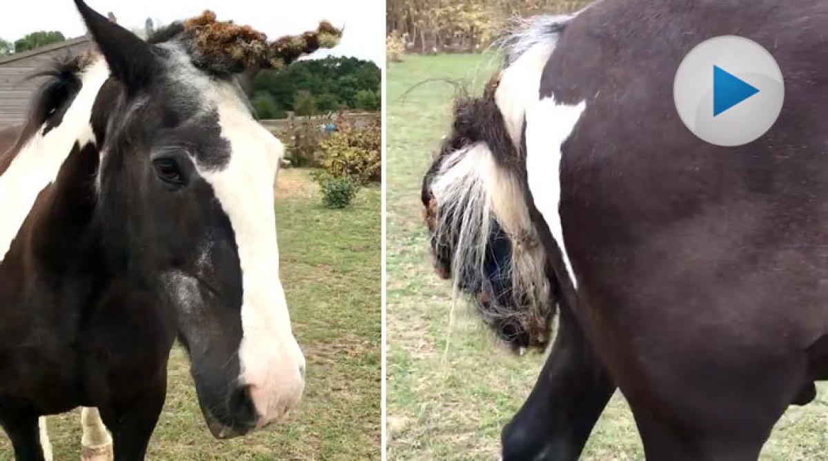 Tistlar i man och svans är inte lätta att få bort, men en tröst kan vara att det sällan blir så illa som för hästen Danny. Inte nog med att tistlarna har skapat ett enhörningshorn i pannan på honom, svansen är dessutom en enda klump.