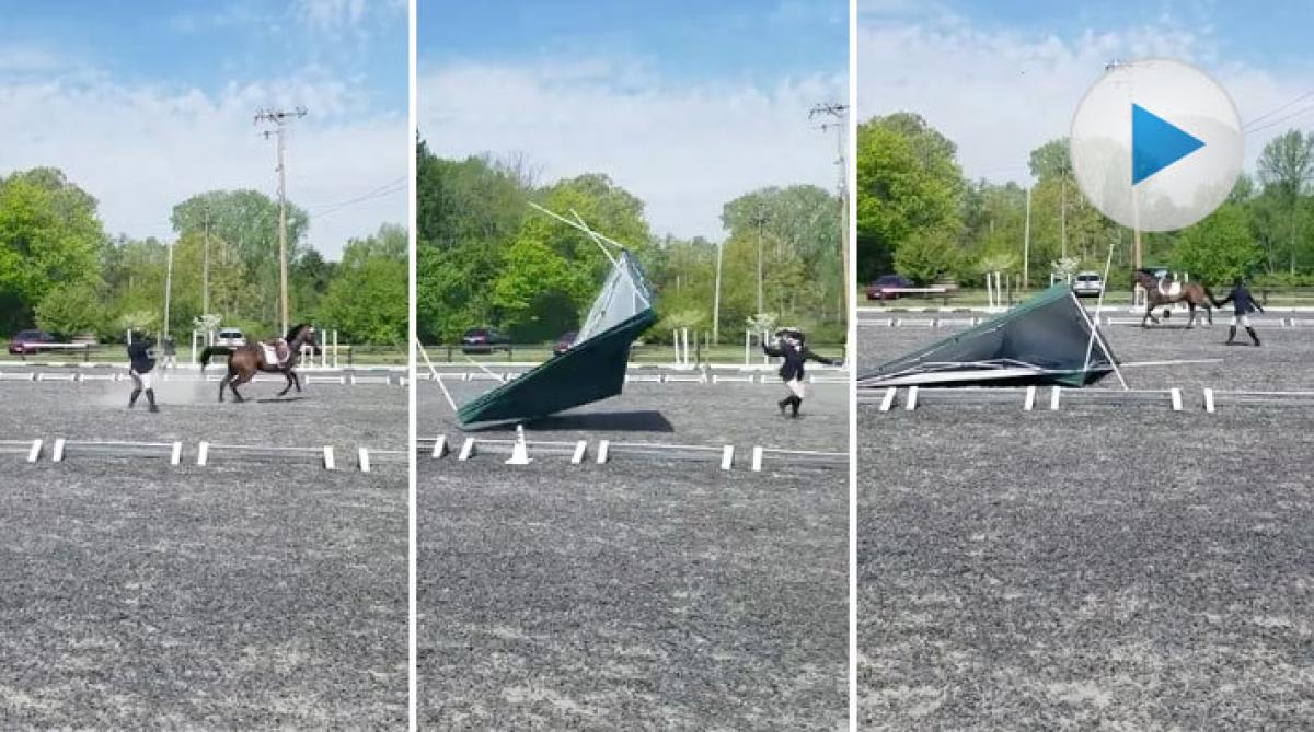För Jennifer Evans från Dayton, Ohio, gick dressyrdebuten strålande – fram till den avslutande hälsningen. Då fick hon och Updraft fly från det flygande domartältet.