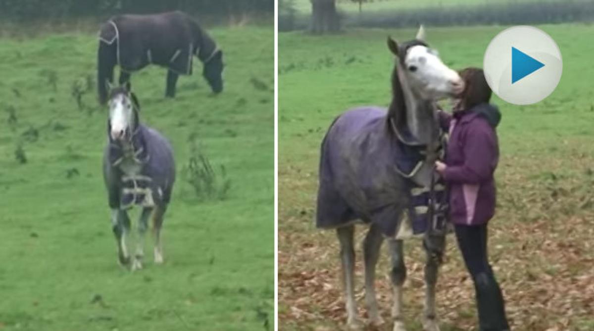 Över fem miljoner tittare på Youtube har sett klippet på den glada ägaren, som återvänder till stallet efter tre veckors utlandssemester.