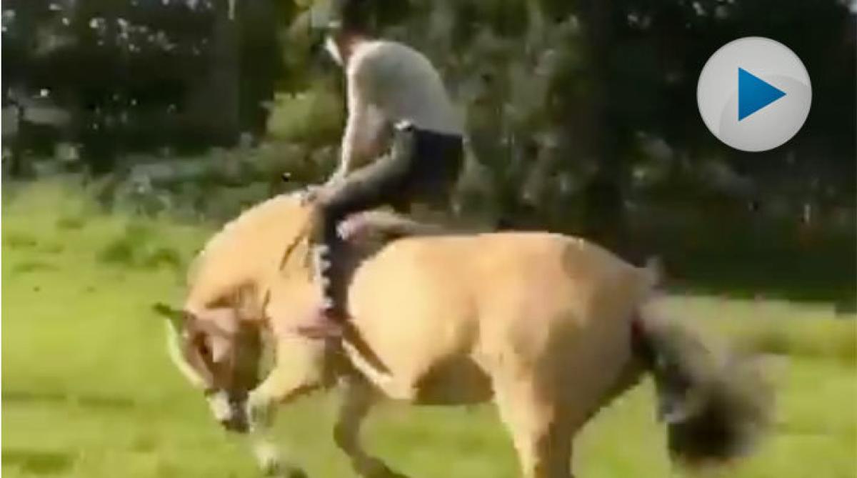 Det är inte lätt att sitta snyggt utan en sadel som stöttar. Om hästen dessutom bestämmer sig för några krumsprång blir det än svårare. Men den här ryttaren lyckas trots allt hålla sig kvar!