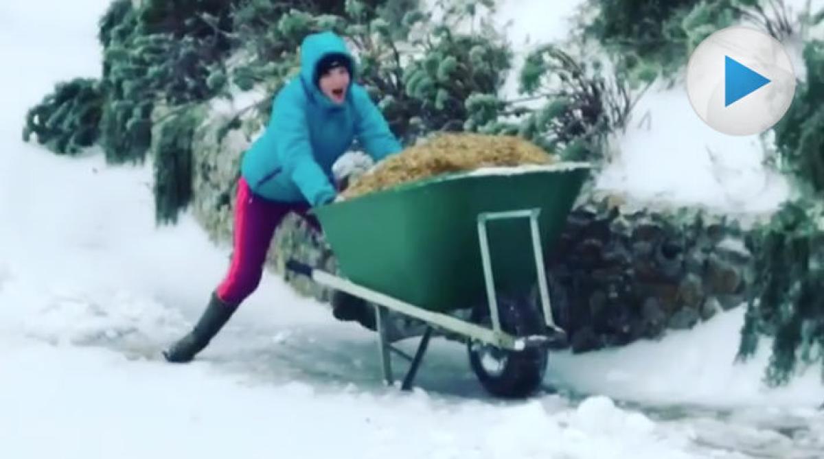 Emily King är dotter till Mary King, och fälttävlansryttare även hon. Men snö i kombination med skottkärrekörning hanterar hon inte lika bra som en terrängbana. Snön ställer till det för britterna, de är inte helt bekväma med underlaget vilket märks i det här klippet.