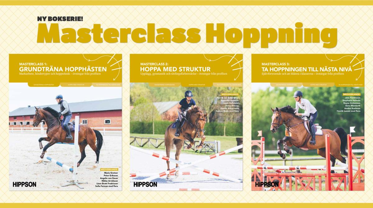 I bokserien "Masterclass Hoppning" har vi sammanställt de absolut bästa tipsen och ridövningarna från kunskapsmagasinet Hippson genom åren. Böckerna innehåller allt från markarbete med bommar till gymnastikhoppning och avancerade styrkeövningar. Övningarna, som kommer från några av Sveriges främsta ryttare och tränare, passar allt från gröna unghästar till tävlande ekipage på lite högre nivå.