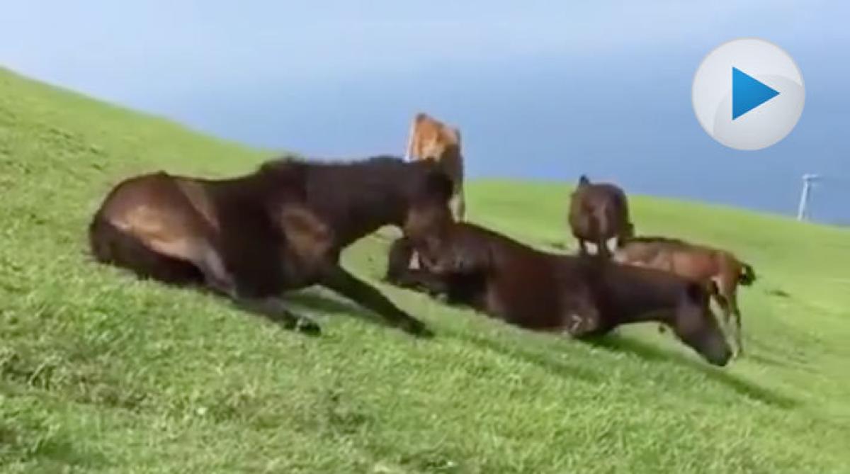 De flesta har väl varit med om att rulla ner för en härligt grön sommarbacke? Här är ett par hästar som har barnasinnet kvar. Vad ska man göra om man har en backe med perfekt lutning i hagen? Rulla så klart!