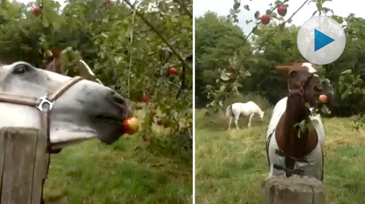 Just nu dignar det av frukt på äppelträden i många trädgårdar. Läsaren Annette Helin har skickat in ett härligt klipp med hästarna Alva (fux) och Donna (skimmel) på Stall Lagnö i Trosa, som för en stund fick besöka ”Edens lustgård”.