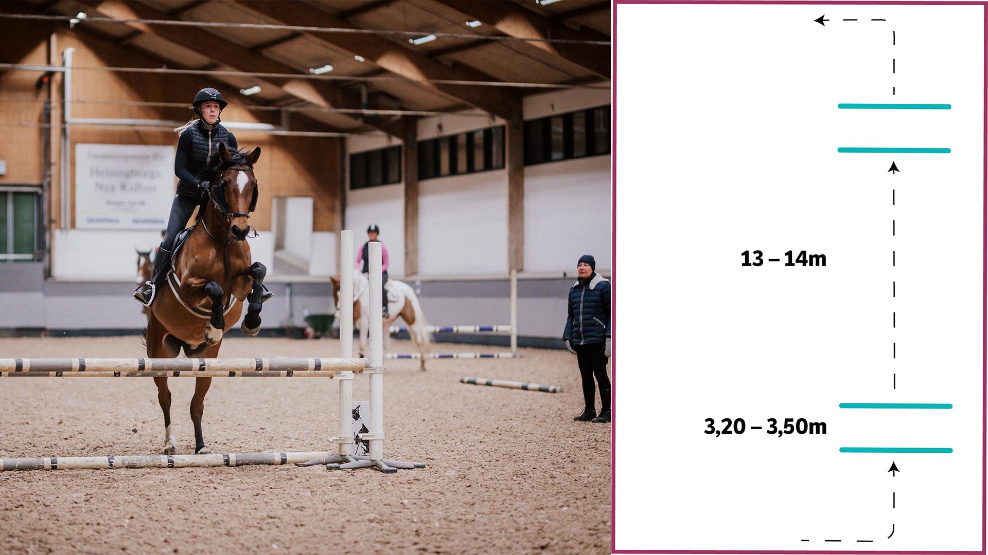 Att kunna känna hur många galoppsprång det ryms mellan två punkter är en viktig del av hoppningen. Den här övningen hjälper ryttaren att bli mer medveten om både rytm och språnglängd i galoppen.