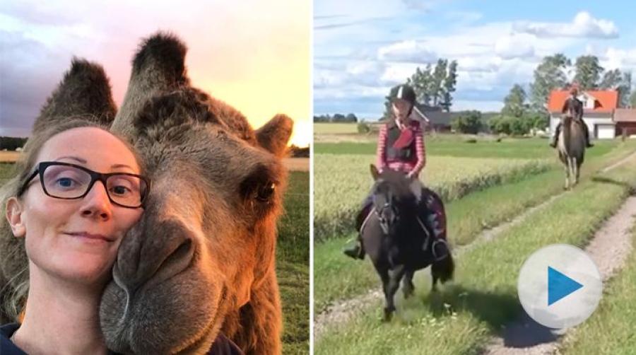 Tilde och shetlandsponnyn Ditte fick i somras sällskap på sin ridtur. Mamma Anna-Carin Karlsson hängde med, ridandes på familjens kamel Judit. Den sexåriga kamelen är klickertränad och inriden. Dessutom kan hon bland annat spela fotboll, lägga sig ner på kommando och pussas. Se klippet ovan – och missa absolut inte Judits många talanger i klippet längre ner i artikeln.