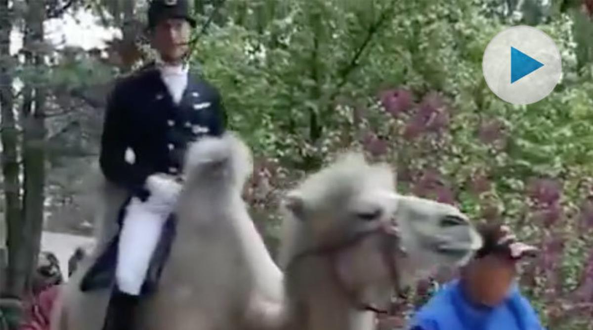 I Hagen verkar de ha tagit fasta på det där med att dressyrhästar många gånger blir överexalterade på prisutdelningar. Så man har i stället valt att låta ryttarna rida in på kameler… Patrik Kittel ser trots allt ut att sitta säkert i sadeln, med skänkeln i rätt läge.